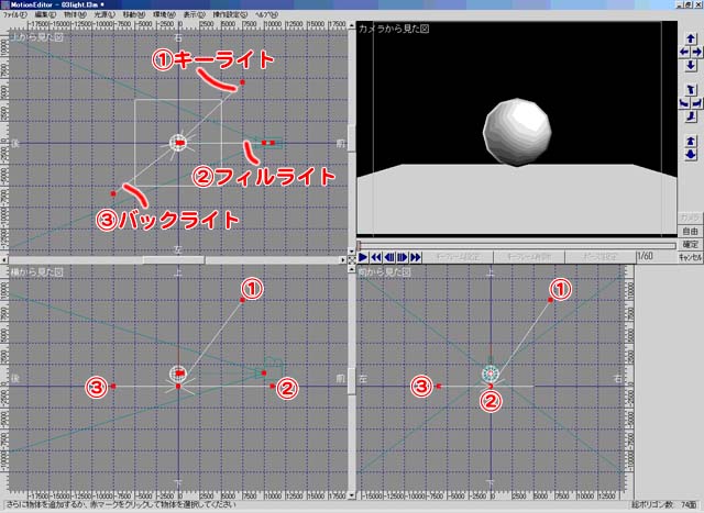 3DCGの場合、回折現象が起きないので、バックライトは、キーライトの対角線上に水平に置く。